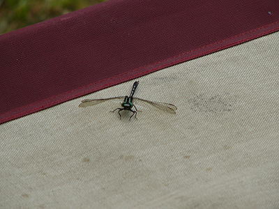 ほどなくもりてつさんファミリーも到着しました。シールドタープの下は涼しいのか、トンボが遊びに来ました。