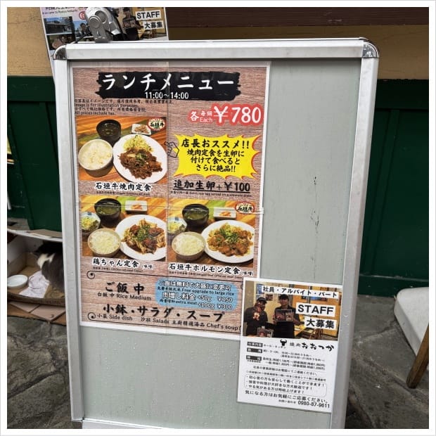 路地をぶらついて、石垣牛焼肉定食が780円で提供している店を発見。さぞかし繁盛してるだろうと店に入ってみると、半分くらいの客入り。