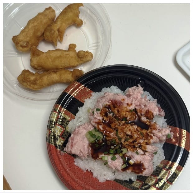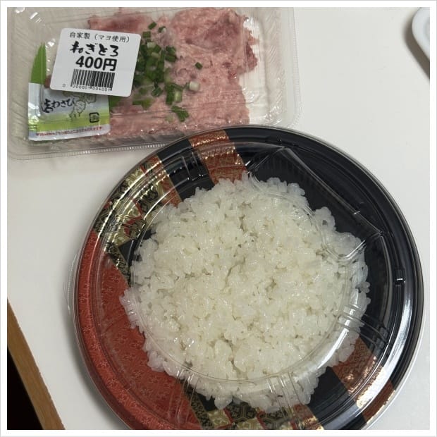 今日はまぐろユッケが無かったので、酢飯250円とねぎとろ400円をチョイス。