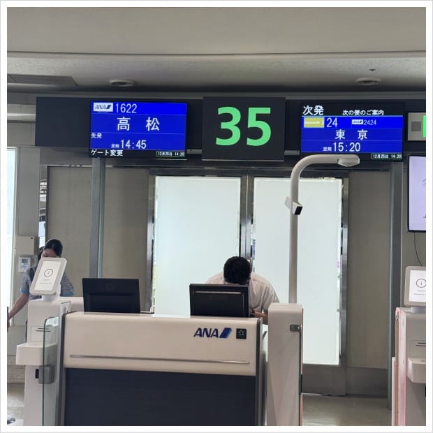 14:17にANA Loungeを出て、14:20に35番搭乗口に到着。機材整備のため、搭乗開始が10分ほど遅れるとのこと。