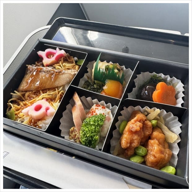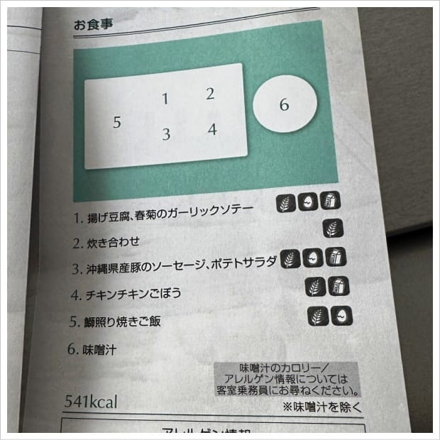 食事が配られる。今日のメインは鰤照りじゃけど、春菊のガーリックソテーが斬新。